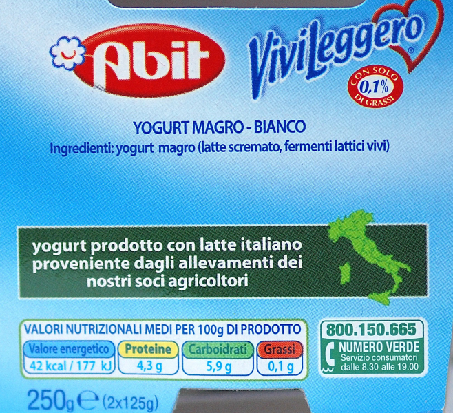 Lo yogurt Vivileggero Magro Bianco dell'Abit ha solamente lo 0,1% di grassi. ...