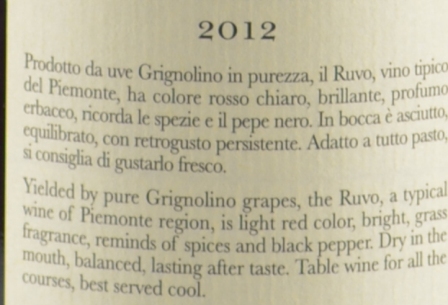 Prodotto da uve Grignolino in purezza, il Ruvo, vino tipico del Piemonte, ha colore rosso chiaro, brillante, profumo erbaceo, ricorda le spezie ed il pepe nero. In bocca è asciutto, equilibrato, con retrogusto persistente. Adatto a tutto pasto, si consiglia di gustarlo fresco.