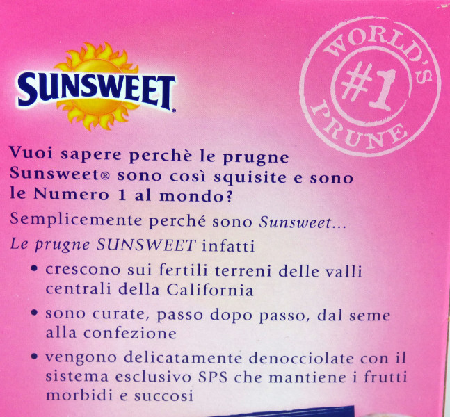 Dall'etichetta : Solo da frutteti californiani di Sunsweet. Denocciolate con un metodo esclusivo per ottenere frutti perfetti.