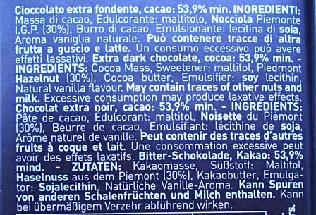 Cioccolato extra fondente, cacao 53,9% e nocciola Piemonte I.G.P. 30%