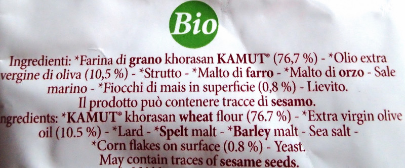 Farina di grano khorasan KAMUT® 76,7%, Olio extravergine di oliva 10,5%, Strutto, Malto di farro, Malto di orzo, Sale marino, Fiocchi di mais in superficie 0,8%, Lievito. ...