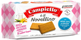 Novellini “classici” nella struttura (frumento + grasso vegetale + componente lattiera), ma con la differenza chiave del claim senza zuccheri aggiunti: lo zucchero viene sostituito da polioli (maltitolo e sciroppo di maltitolo). Ci aspettiamo una dolcezza più “morbida” e meno pungente rispetto allo zucchero, con una consistenza sempre da biscotto da colazione semplice e regolare.