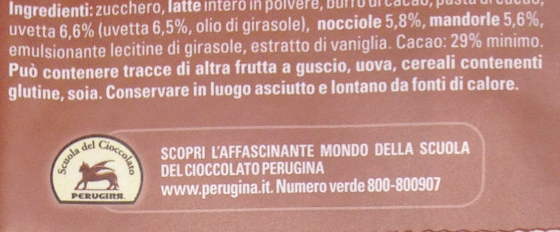 Dall'etichetta : cioccolato al latte Ingredienti, percentuali in etichetta : uvetta 6,6% (uvetta 6,5%, olio di girasole) nocciole 5,8%, mandorle 5,6% cacao 29% minimo ...