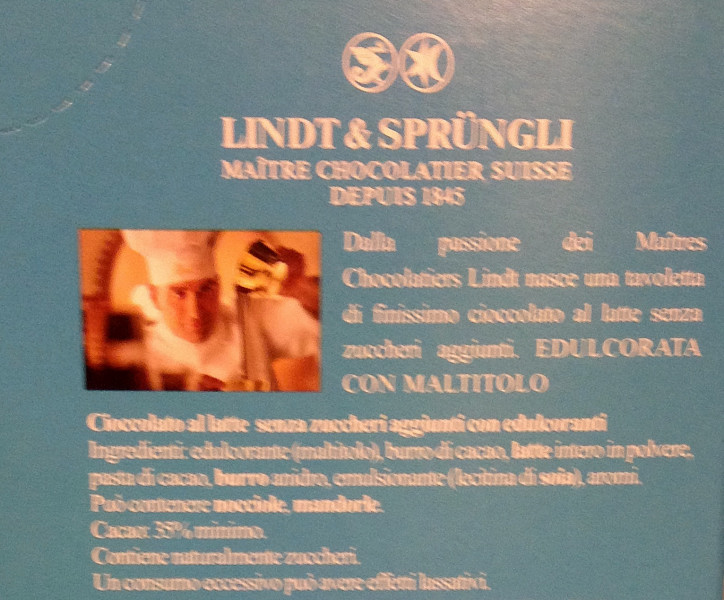 Dall'etichetta : SENZA ZUCCHERI AGGIUNTI con maltitolo Ingredienti, percentuali in etichetta : cacao 35% minimo ...