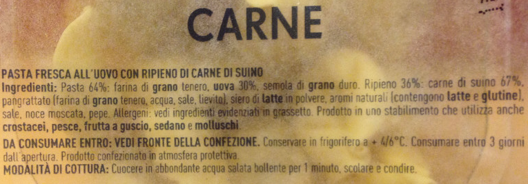 Tortellini piuttosto calorici (309 kcal) trattandosi di ripieno di carne di maiale.