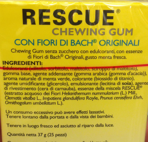 Dall'etichetta : Chewing Gum senza zucchero con edulcoranti, con essenze di Fiori di Bach® Originali, gusto menta fresca ...
