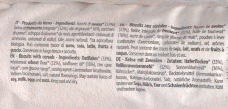 Ingredienti, percentuali in etichetta : fiocchi di avena 33% farina di frumento integrale 32% olio di girasole 16% ...