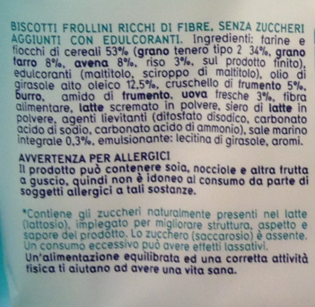 Dall'etichetta : senza olio di palma per un minore aumento della glicemia Ingredienti, percentuali in etichetta : farine e fiocchi di cereali 53% olio di girasole 12,5% cruschello di fru ...