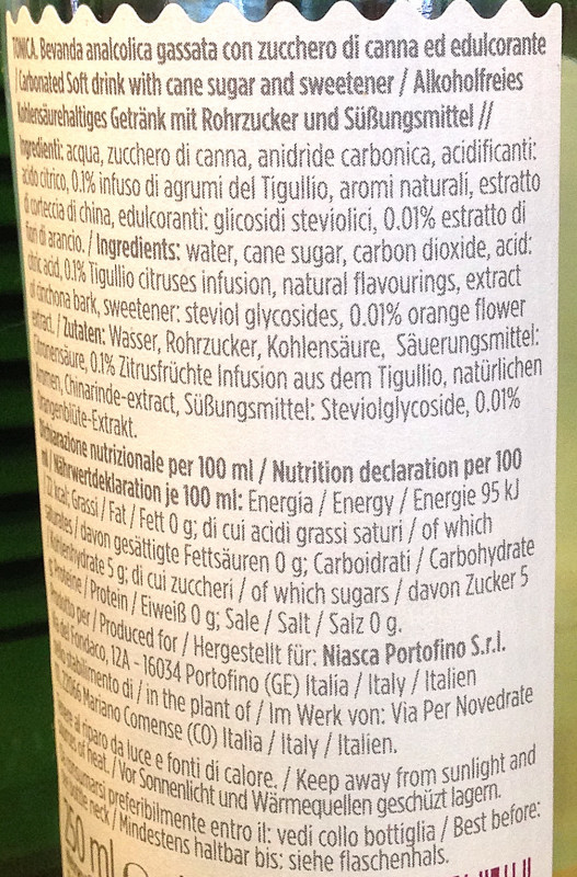 Recensione Nasca Portofino Tonica Dall'etichetta : Bevanda gassata con zucchero di canna ed edulcorante Ingredienti, percentuali in etichetta : infuso di agrumi del Tigullio 0,1% ...