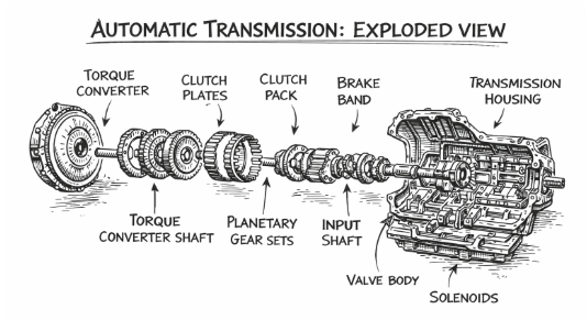 Il classico automatico AT usa un convertitore di coppia per collegare motore e trasmissione, permettendo partenze molto fluide e smorzando vibrazioni; nelle condizioni di marcia stabilizzata interviene spesso una frizione di lock-up che elimina lo slittamento del convertitore e migliora l’efficienza. La selezione dei rapporti avviene tramite treni epicicloidali e frizioni/freni multidisco comandati idraulicamente.