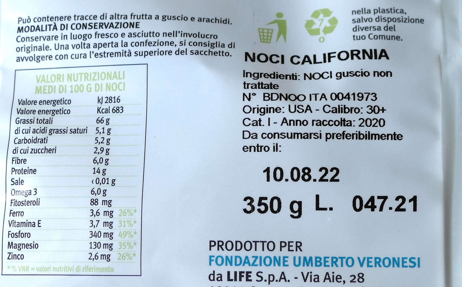 Il contenuto della noce è piuttosto calorico, ma i benefici di una moderata ssunzione sono molti e sono descritti nella parte posteriore della confezione.