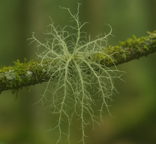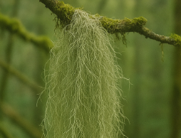 L’Usnea barbata è un lichene affascinante e inconfondibile, formato dall’unione simbiotica tra un’alga e un fungo, che compare come una massa filamentosa, sottile e ramificata. Cresce sospesa dai rami degli alberi, soprattutto in boschi umidi e incontaminati, dove l’aria è pura e priva di inquinanti: proprio per questo la sua presenza viene spesso considerata un indicatore naturale di qualità ambientale. Il suo aspetto richiama una piccola barba grigio-verde, composta da filamenti elastici e morbidi che si allungano in forme irregolari, ondeggianti al vento e leggermente ruvidi al tatto.