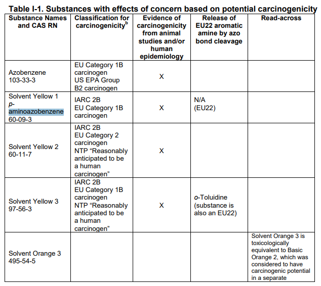 Synopsis. Pursuant to sections 68 or 74 of the Canadian Environmental Protection Act, 1999 (CEPA 1999), the Ministers of the Environment and of Health have conducted a screening assessment on 22 Azo Solvent Dyes. These substances constitute a subgroup of the Aromatic Azo and Benzidine-based Substance Grouping being assessed as part of the Groupings Initiative of Canada’s Chemicals Management Plan (CMP) based on structural similarity and applications. Substances in this grouping were identified as priorities for assessment as they met the categorization criteria under subsection 73(1) of CEPA 1999 and/or were considered as a priority based on other human health concerns. The Chemical Abstracts Service Registry Number (CAS RN)1, Domestic Substances List (DSL) name, and Colour Index (C.I) name or common name of the 22 substances are presented in the following table.....