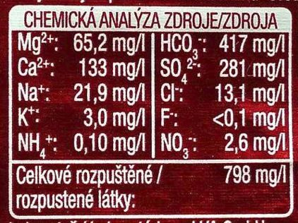 Discreta acqua minerale, non leggera per la presenza consistente di Calcio, Magnesio e una presenza non irrilevante di Sodio, adatta a chi può avere carenza di questi sali minerali.