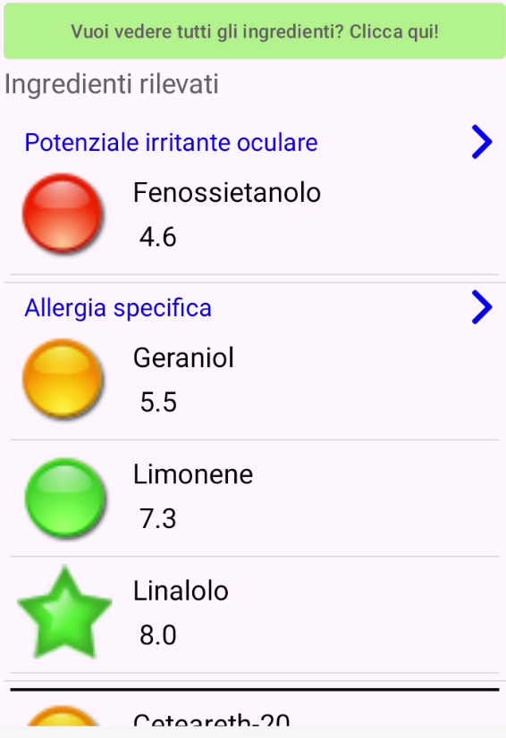 - se accanto all'ingrediente arancione compare "Quantità rilevante" consigliamo di utilizzare sporadicamente il prodotto controllando eventuali irritazioni.