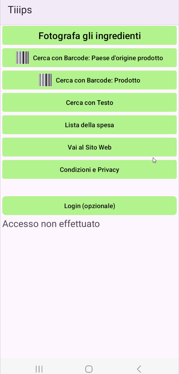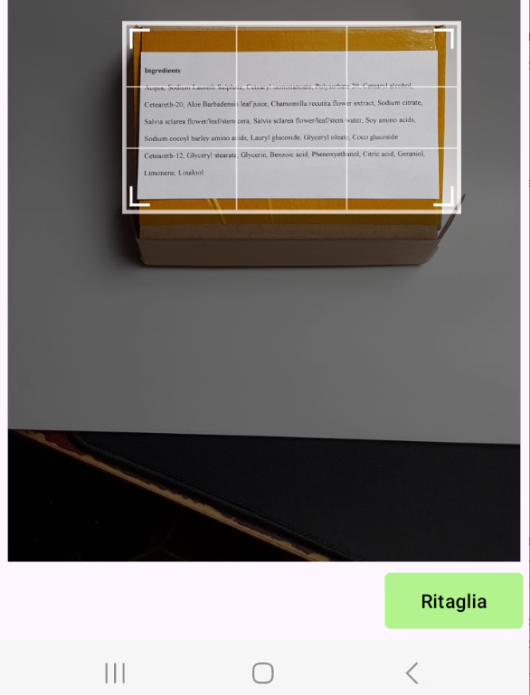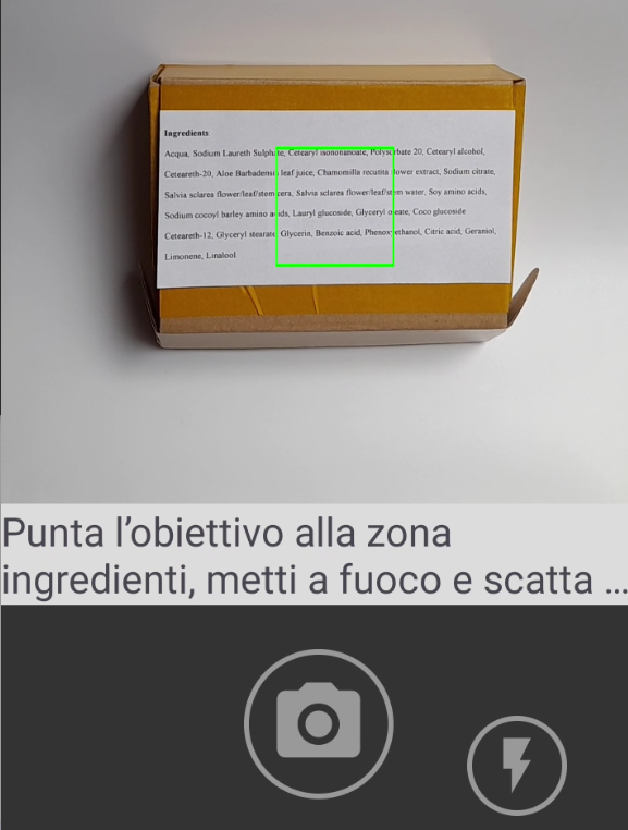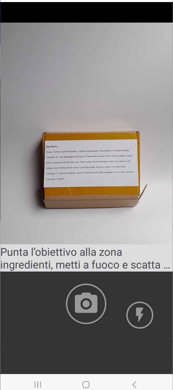 Per dare agli utenti il più ampio risultato possibile nella ricerca degli ingredienti, abbiamo optato per la lettura dell'etichetta contenente gli ingredienti, abbandonando il codice a barre, in tal modo migliorando sensibilmente la funzionalità.