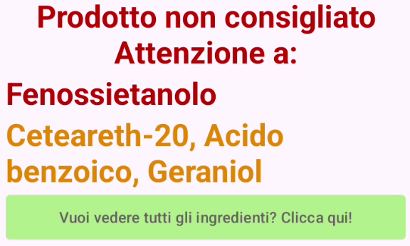 - Se compare qualche ingrediente rosso, sarà visualizzato un messaggio che dice " Prodotto non consigliato. Attenzione a..." e saranno elencati gli ingredienti con colore rosso.