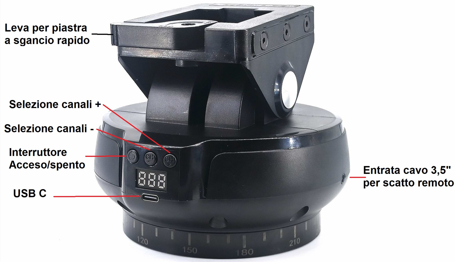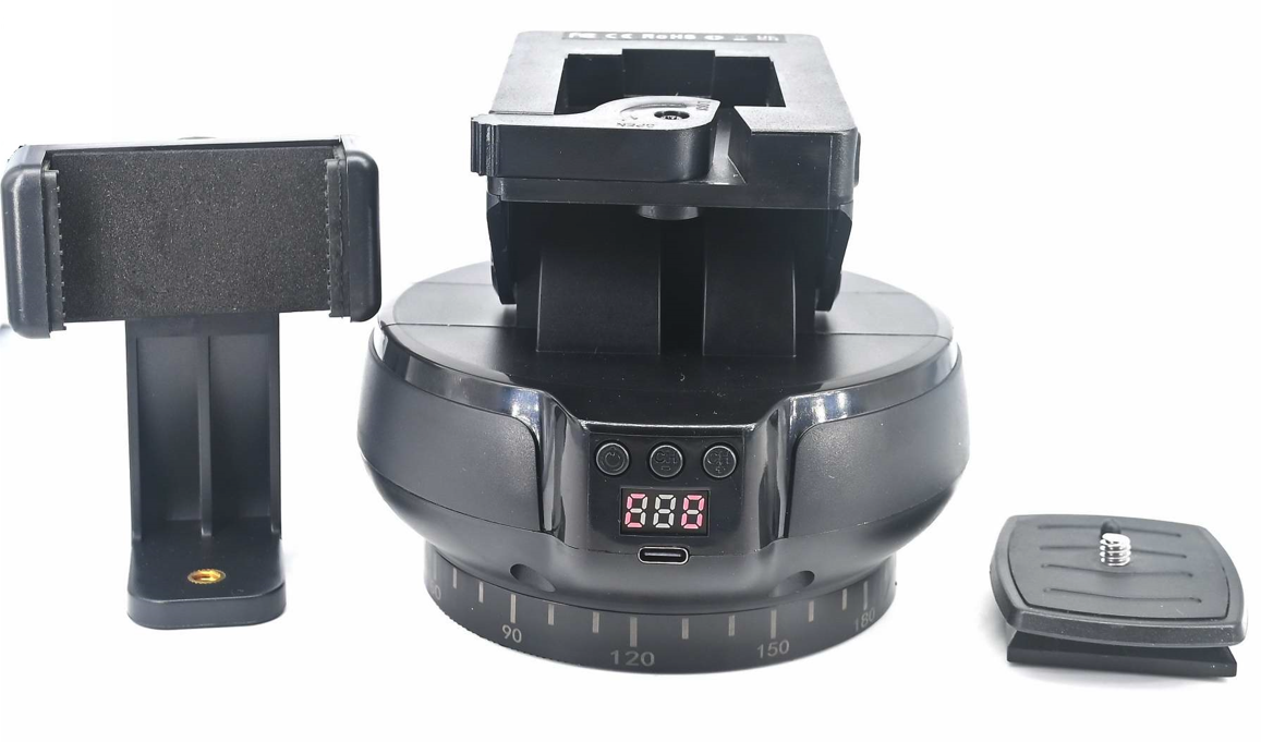 Questo oggetto è una testa motorizzata (con vite da fotografia da 1/4" sulla piastra a sgancio rapido) per treppiede che permette, tramite telecomando, ad una telecamera o ad uno smartphone di girare a destra, sinistra, avanti indietro. Il che è molto comodo per riprese in diretta, panorama ecc.