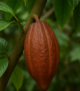 The fruit, commonly called cacao pod or cabossa, is an elongated berry, ovoid to obovate, with a thick, fibrous rind and longitudinal ridges. At maturity its colour ranges from yellow–orange to red or purplish, depending on variety and growing conditions. Each pod contains 20–60 seeds (cocoa beans), embedded in a whitish, sugary, aromatic pulp. After fermentation and drying, the seeds form the raw material for cocoa and chocolate, while the pulp is increasingly being used as a by-product for juices, beverages and other food preparations.