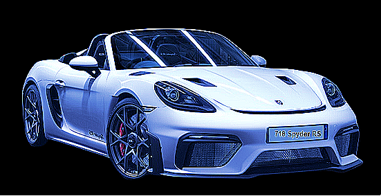 La 718 Spyder RS è una roadster sportiva a due posti con motore centrale-collector, carrozzeria leggera in alluminio e parti in materiale composito, parafanghi anteriori, cofano e portellone in CFRP, e cerchi da 20″ forgiate in magnesio. Il profilo è ribassato grazie alle sospensioni sportive RS, e il cofano è addolcito dalla capote in tessuto amovibile a mano. Gli interni puntano al minimalismo racing: sedili a guscio in CFRP rivestiti in Alcantara, volante in Alcantara con marcatura centrale, interruttori in metallo e manettino del PASM arancione.