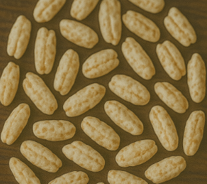 Dal punto di vista fisico-strutturale, il riso integrale soffiato presenta bassa densità apparente, elevato volume specifico e una texture croccante e friabile, dovuta alla rete di cavità formate durante l’espansione. La presenza della crusca fa sì che permangano frazioni fibrose e composti associati alle parti esterne del chicco (per esempio una quota di minerali e composti fenolici), pur con una modifica sostanziale della struttura dell’endosperma amidaceo. L’amido risulta in parte gelatinizzato e in parte ridistribuito nella matrice espansa, con effetti sulla capacità di assorbire liquidi e sulla cinetica di reidratazione.