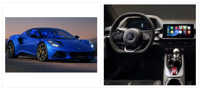 Emira Turbo: 2.0 turbo 4 cilindri (AMG), 360 bhp / 269 kW, DCT 8 rapporti, 0–100 km/h 4,4 s, Vmax 275 km/h.