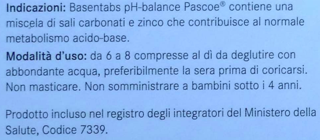 L’integratore Basentabs pH-balance Pascoe presenta una formulazione coerente con la dichiarazione di supporto al metabolismo acido-base.