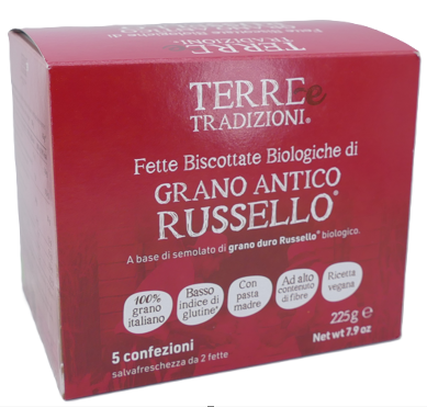 Fette biscottate biologiche con una base quasi interamente di grano duro antico Russello, cereale tradizionale italiano, in particolare siciliano. Il prodotto è presentato come con 100% grano italiano, con pasta madre, ricetta vegana e alto contenuto di fibre.