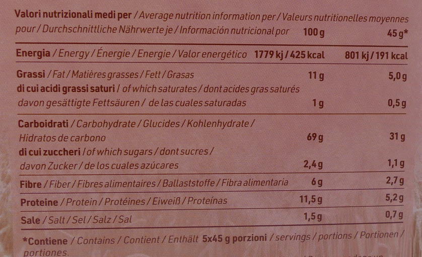 Il dato meno favorevole è il sale: 1,5 g/100 g. Per il criterio che uso nelle valutazioni, questo valore è alto, perché supera 1 g/100 g. Anche sulla porzione da 45 g, 0,7 g non è trascurabile, soprattutto se le fette vengono abbinate a ingredienti salati, abitudine da evitare.