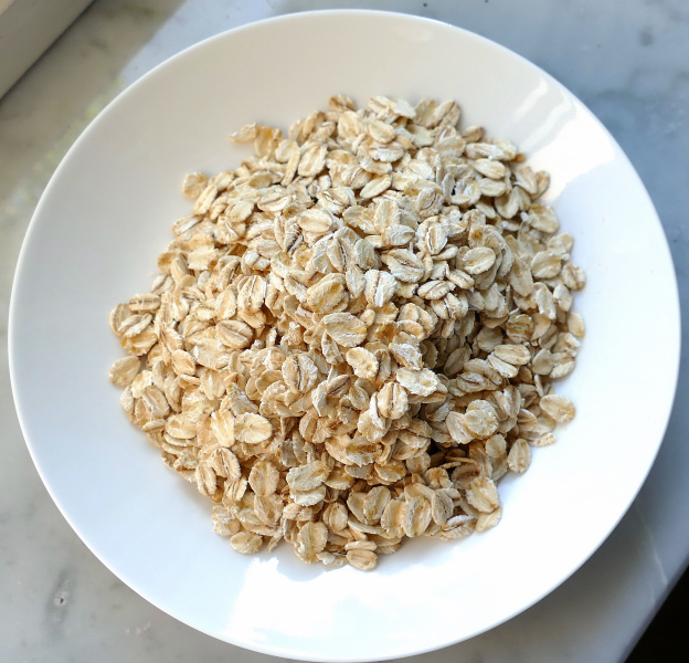 Oat flakes have a flat, oval shape, with a color that ranges from light brown to beige.