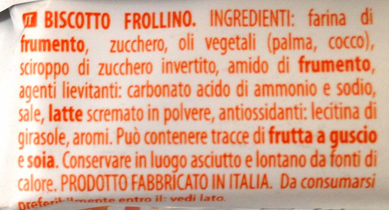 Barcode EAN:   8000605020269 Energy kcal/100g:   461 Satured Fat (per 100g)g:   7.2 Sugar into Carbohydrates (per 100g)g:   23 Proteines (per 100g)g:   7.8 Calcium CA/ mg (per 100g)g:   Gluten:   Production type:   Made in:   Italy Price €:   Bought here:   Last update:   2013-02-24 11:26:45 | Brand:   Fat (per 100g)g:   16 Carbohydrates (per 100g)g:   71 Fiber (per 100g)g:   Salt - Sodium (per 100g)g:   0.6 Ingredients (Indicative):   |