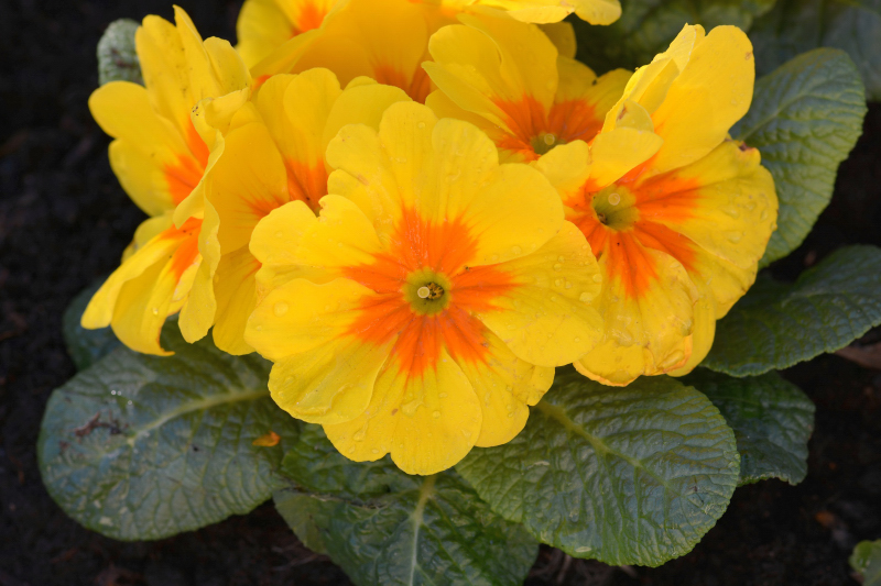 Primroses form a large genus of herbaceous perennials in the family Primulaceae. They typically grow as compact basal rosettes, with plants usually ranging from about 5 to 30 cm in height depending on the species and cultivar. The leaves are oblong to spatulate, with a slightly crenate or dentate margin and a surface that is often somewhat wrinkled; the colour is light to medium green, sometimes darker in montane or woodland forms.