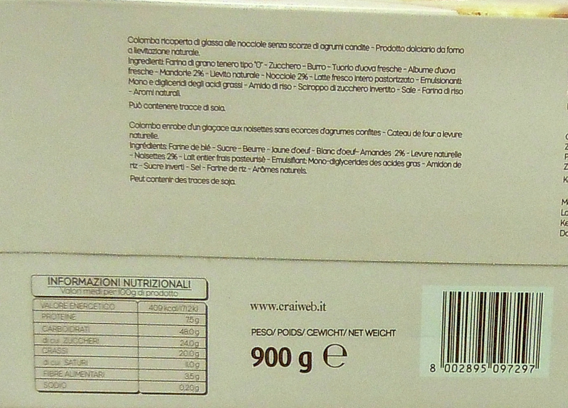 Barcode EAN:   8002895097297 Energy kcal/100g:   409 Satured Fat (per 100g)g:   11 Sugar into Carbohydrates (per 100g)g:   24 Proteines (per 100g)g:   7.5 Calcium CA/ mg (per 100g)g:   Gluten:   Production type:   Made in:   Italy Price €:   Bought here:   Last update:   2013-04-06 21:27:39 | Brand:   Fat (per 100g)g:   20 Carbohydrates (per 100g)g:   48 Fiber (per 100g)g:   3.5 Salt - Sodium (per 100g)g:   0.2 Ingredients (Indicative):   |