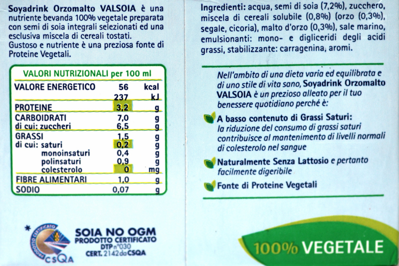 Barcode EAN:   8006040241603 Energy kcal/100g:   56 Satured Fat (per 100g)g:   0.2 Sugar into Carbohydrates (per 100g)g:   6.5 Proteines (per 100g)g:   3.2 Calcium CA/ mg (per 100g)g:   Gluten:   Production type:   Made in:   Italy Price €:   Bought here:   Last update:   2013-04-09 16:20:19 | Brand:   Fat (per 100g)g:   1.5 Carbohydrates (per 100g)g:   7 Fiber (per 100g)g:   1 Salt - Sodium (per 100g)g:   0.07 Ingredients (Indicative):   |