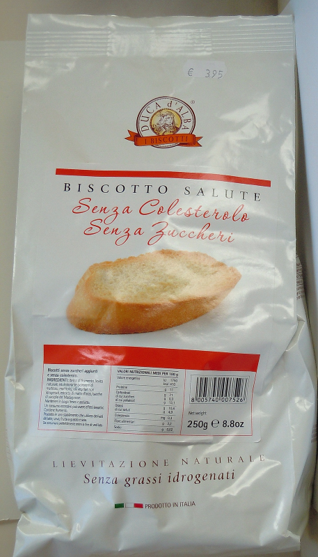 Barcode EAN:   8005740007526 Energy kcal/100g:   410 Satured Fat (per 100g)g:   4.9 Sugar into Carbohydrates (per 100g)g:   0.3 Proteines (per 100g)g:   11 Calcium CA/ mg (per 100g)g:   Gluten:   Production type:   Made in:   Italy Price €:   Bought here:   Last update:   2013-04-12 17:40:13 | Brand:   Fat (per 100g)g:   10.4 Carbohydrates (per 100g)g:   71 Fiber (per 100g)g:   3.2 Salt - Sodium (per 100g)g:   0.02 Ingredients (Indicative):   |
