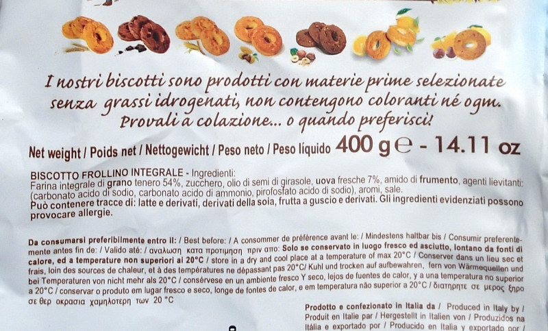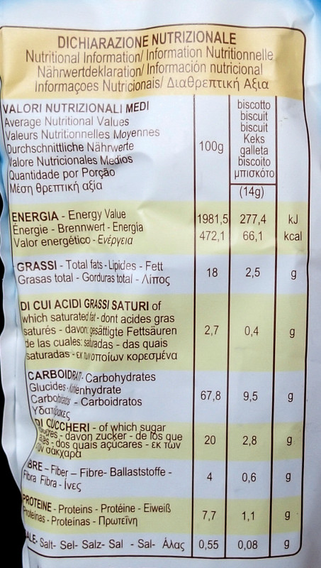 Barcode EAN:   8005121214253 Energy kcal/100g:   472.1 Satured Fat (per 100g)g:   2.7 Sugar into Carbohydrates (per 100g)g:   20 Proteines (per 100g)g:   7.7 Calcium CA/ mg (per 100g)g:   Gluten:   Production type:   Made in:   Italy Price €:   Bought here:   Last update:   2013-04-29 18:29:07 | Brand:   Fat (per 100g)g:   18 Carbohydrates (per 100g)g:   67.8 Fiber (per 100g)g:   4 Salt - Sodium (per 100g)g:   0.55 Ingredients (Indicative):   |