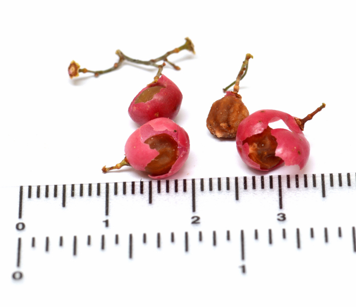 Dried pink peppercorns have a very distinctive appearance: a thin pericarp, bright pink to light red, and a hard inner seed; the outer shell is brittle and breaks easily. The aroma is complex: fruity, slightly resinous, with balsamic notes and a gentle peppery hint, but overall much sweeter and milder than black pepper.