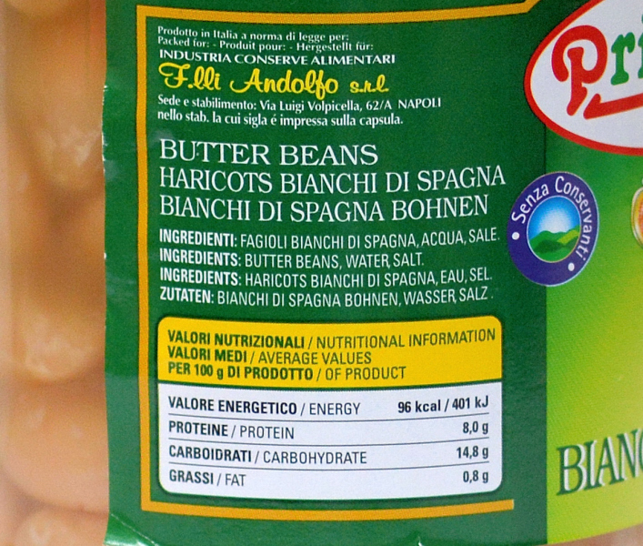 Barcode EAN:   Energy kcal/100g:   96 Satured Fat (per 100g)g:   Sugar into Carbohydrates (per 100g)g:   Proteines (per 100g)g:   8 Calcium CA/ mg (per 100g)g:   Gluten:   Production type:   Made in:   Italy Price €:   Last update:   2014-01-11 19:18:25 | Brand:   Fat (per 100g)g:   Carbohydrates (per 100g)g:   14.8 Fiber (per 100g)g:   Salt - Sodium (per 100g)g:   Ingredients (Indicative):   Bought here:   |