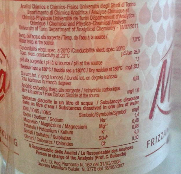 Barcode EAN:   8010333001942 Source altitude mt:   Temperature at the source °C:   7.6 Hardness:   1.3 Elecrical power ms/cm 20/25°:   30 Nitrate NO3mg/l:   Clorure Clmg/l:   0.19 Sodium Na1mg/l:   1.3 Magnesium Mg2mg/l:   0.6 Fluorine Fmg/l:   Free carbon dioxide at the source CO2mg/ll:   1 Price €:   Last update:   2019-08-14 16:46:50 | Brand:   Year analisys:   2017 Total dissolved solids mg/L at 180°:   24.7 pH at source:   7.4 Oxidability O2mg/l:   Bicarbonate HCO3mg/l:   Sulphate SO4mg/l:   3.6 Calcium Ca2mg/l:   Potassium K1mg/l:   0.56 Silica SiO2mg/l:   Country:   Italy Bought here:   |