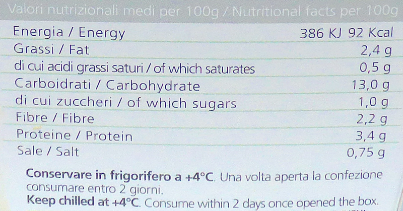 Barcode EAN:   8025046004609 Valore energetico kcal/100g:   386 Grassi saturi nei grassi (per 100g)g:   0.5 Zuccheri nei carboidrati(per 100g)g:   1 Proteine (per 100g)g:   Calcio CA/ mg per 100g:   Glutine:   Tipologia di produzione, es. bio:   Prodotto in:   Italia Prezzo indicativo €:   Comprato qui:   Ultimo aggiornamento:   2015-01-03 11:08:06 | Marca:   Grassi (per 100g)g:   2.4 Carboidrati (per 100g)g:   13 Fibre (per 100g)g:   2.2 Sale - Sodio (per 100g)g:   0.75 Ingredienti (Indicativo. Quantità decrescenti in etichetta):   |