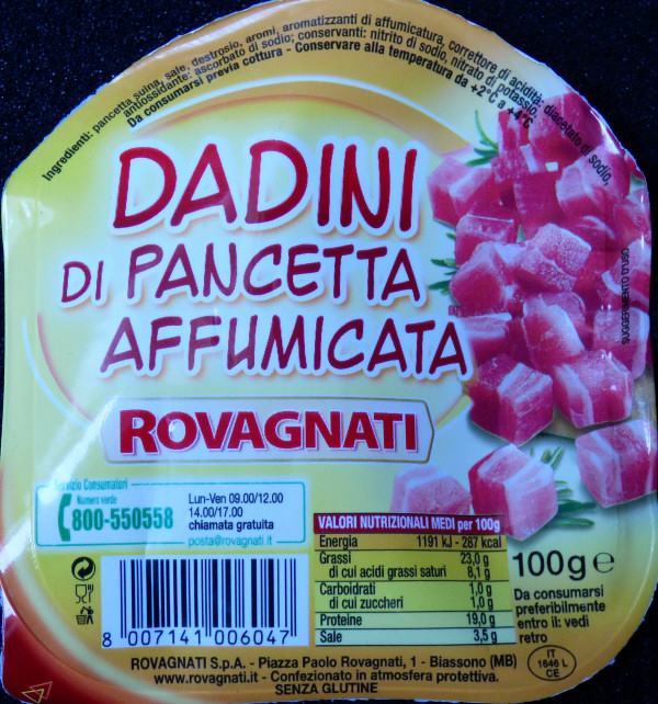 Barcode EAN:   8007141006047 Energy kcal/100g:   287 Satured Fat (per 100g)g:   8.1 Sugar into Carbohydrates (per 100g)g:   1 Proteines (per 100g)g:   19 Calcium CA/ mg (per 100g)g:   Gluten:   Production type:   Made in:   Italy Price €:   Bought here:   Last update:   2015-01-10 19:29:59 | Brand:   Fat (per 100g)g:   23 Carbohydrates (per 100g)g:   1 Fiber (per 100g)g:   Salt - Sodium (per 100g)g:   3.5 Ingredients (Indicative):   |