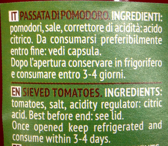 Barcode EAN:   80039990 Energy kcal/100g:   30 Satured Fat (per 100g)g:   0.1 Sugar into Carbohydrates (per 100g)g:   3.9 Proteines (per 100g)g:   1.2 Calcium CA/ mg (per 100g)g:   Gluten:   Production type:   Made in:   Italy Price €:   Last update:   2015-01-27 15:48:02 | Brand:   Fat (per 100g)g:   0.1 Carbohydrates (per 100g)g:   4.9 Fiber (per 100g)g:   1.5 Salt - Sodium (per 100g)g:   0.38 Ingredients (Indicative):   Bought here:   |