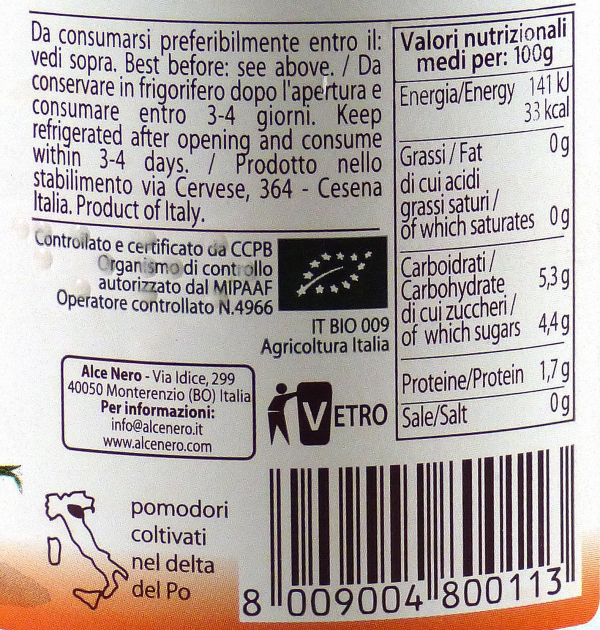 Barcode EAN:   8009004800113 Energy kcal/100g:   33 Satured Fat (per 100g)g:   0 Sugar into Carbohydrates (per 100g)g:   4.4 Proteines (per 100g)g:   1.7 Calcium CA/ mg (per 100g)g:   Gluten:   Made in:   Italy Bought here:   Last update:   2015-02-15 17:40:46 | Brand:   Fat (per 100g)g:   0 Carbohydrates (per 100g)g:   5.3 Fiber (per 100g)g:   Salt - Sodium (per 100g)g:   0 Ingredients (Indicative):   Production type:   Price €:   |