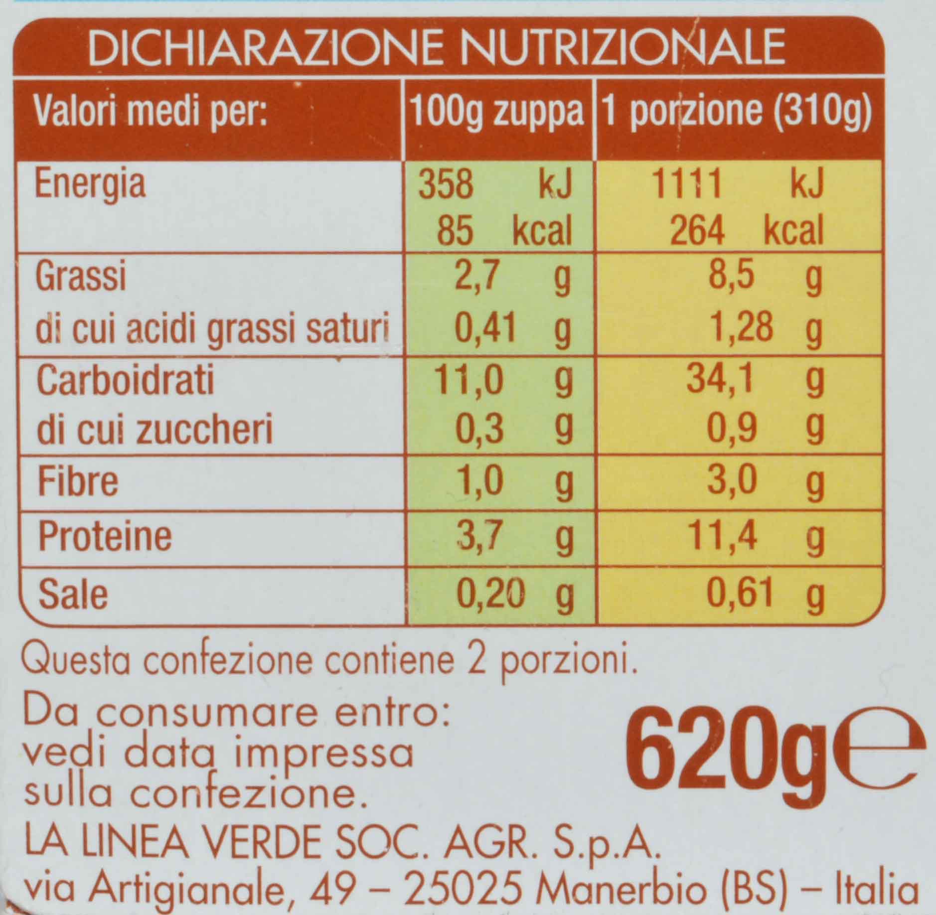 Barcode EAN:   8014190002791 Energy kcal/100g:   85 Satured Fat (per 100g)g:   0.41 Sugar into Carbohydrates (per 100g)g:   0.3 Proteines (per 100g)g:   3.7 Calcium CA/ mg (per 100g)g:   Gluten:   Production type:   Made in:   Italy Price €:   Bought here:   Last update:   2015-03-01 19:39:37 | Brand:   Fat (per 100g)g:   2.7 Carbohydrates (per 100g)g:   11 Fiber (per 100g)g:   1 Salt - Sodium (per 100g)g:   0.2 Ingredients (Indicative):   |