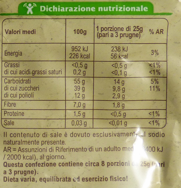 Barcode EAN:   8012666044597 Energy kcal/100g:   226 Satured Fat (per 100g)g:   0.2 Sugar into Carbohydrates (per 100g)g:   39 Proteines (per 100g)g:   1.5 Calcium CA/ mg (per 100g)g:   Gluten:   Made in:   Argentina Bought here:   Last update:   2015-12-21 19:40:02 | Brand:   Fat (per 100g)g:   0.4 Carbohydrates (per 100g)g:   55 Fiber (per 100g)g:   7 Salt - Sodium (per 100g)g:   Ingredients (Indicative):   Production type:   Price €:   |