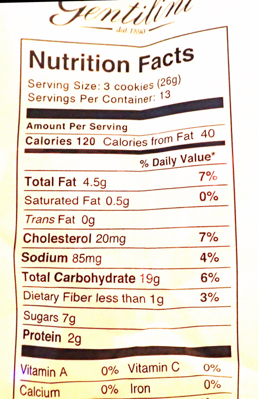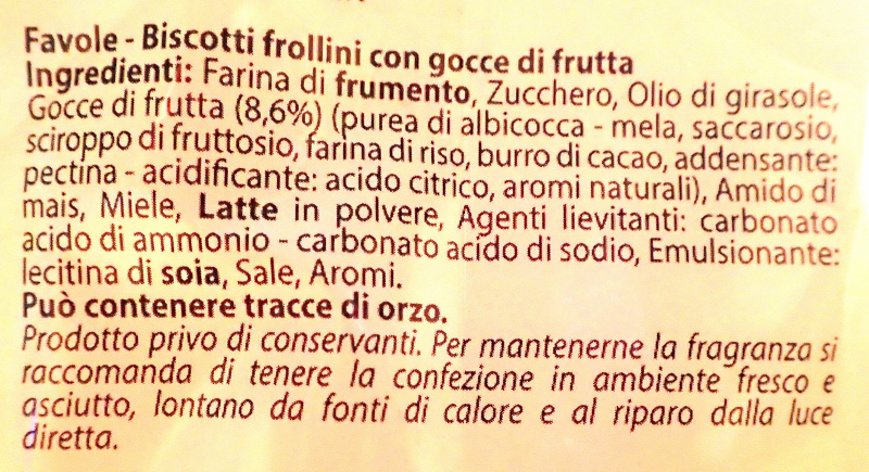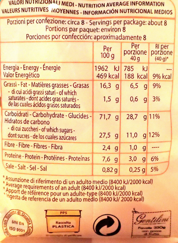 Barcode EAN:   8007465800741 Energy kcal/100g:   469 Satured Fat (per 100g)g:   1.5 Sugar into Carbohydrates (per 100g)g:   27.5 Proteines (per 100g)g:   7.6 Calcium CA/ mg (per 100g)g:   Gluten:   Production type:   Made in:   Italy Price €:   Bought here:   Last update:   2015-12-24 10:27:13 | Brand:   Fat (per 100g)g:   16.3 Carbohydrates (per 100g)g:   71.7 Fiber (per 100g)g:   2.4 Salt - Sodium (per 100g)g:   0.82 Ingredients (Indicative):   |