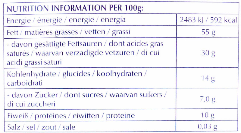Barcode EAN:   3046920029759 Energy kcal/100g:   592 Satured Fat (per 100g)g:   30 Sugar into Carbohydrates (per 100g)g:   7 Proteines (per 100g)g:   10 Calcium CA/ mg (per 100g)g:   Gluten:   Production type:   Made in:   Germany Price €:   Bought here:   Last update:   2016-01-06 12:15:15 | Brand:   Fat (per 100g)g:   55 Carbohydrates (per 100g)g:   14 Fiber (per 100g)g:   Salt - Sodium (per 100g)g:   0.03 Ingredients (Indicative):   |