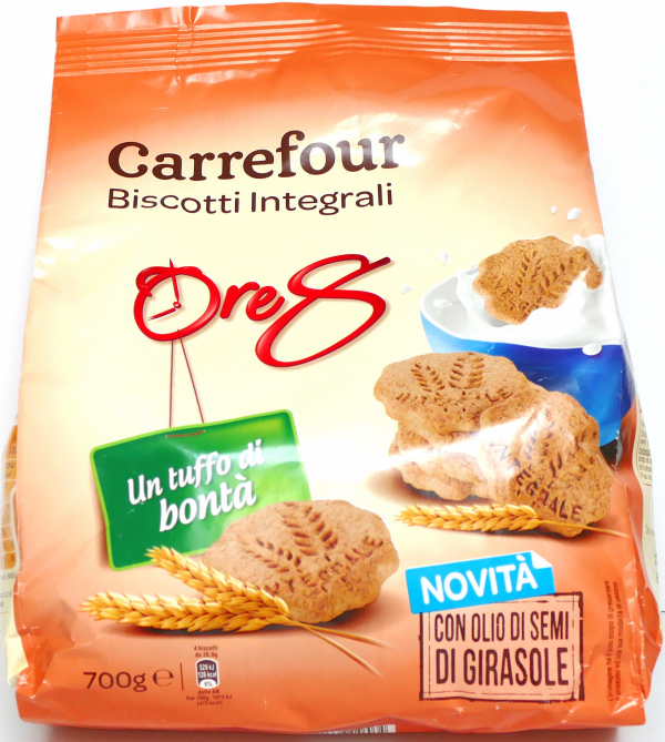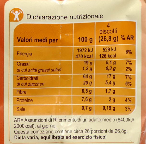 Barcode EAN:   8012666046034 Energy kcal/100g:   470 Satured Fat (per 100g)g:   1.2 Sugar into Carbohydrates (per 100g)g:   20 Proteines (per 100g)g:   7.6 Calcium CA/ mg (per 100g)g:   Gluten:   Production type:   Made in:   Italy Price €:   Bought here:   Last update:   2016-05-10 17:42:01 | Brand:   Fat (per 100g)g:   19 Carbohydrates (per 100g)g:   64 Fiber (per 100g)g:   6.5 Salt - Sodium (per 100g)g:   0.7 Ingredients (Indicative):