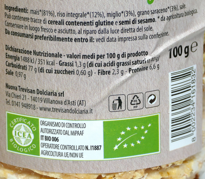 Barcode EAN:   8002234161832 Energy kcal/100g:   351 Satured Fat (per 100g)g:   0.4 Sugar into Carbohydrates (per 100g)g:   0.6 Proteines (per 100g)g:   6.6 Calcium CA/ mg (per 100g)g:   Gluten:   Production type:   Made in:   Italy Price €:   Bought here:   Last update:   2016-05-26 18:26:31 | Brand:   Fat (per 100g)g:   1.3 Carbohydrates (per 100g)g:   77 Fiber (per 100g)g:   2.3 Salt - Sodium (per 100g)g:   0.97 Ingredients (Indicative):   |