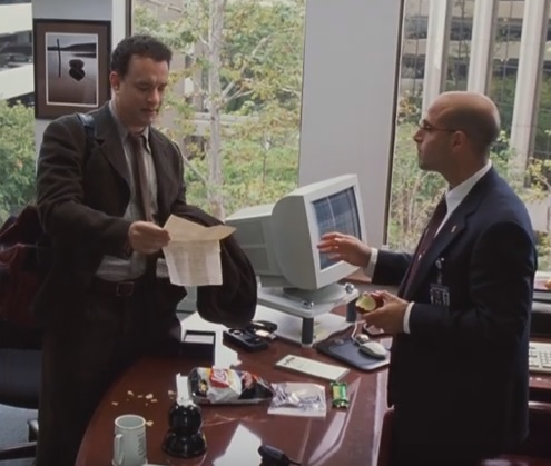 Viktor Navorski (played by Tom Hanks) arrives at New York City's John F. Kennedy Airport from Krakozhia, an Eastern European country. However, while he is in transit, a civil war erupts in his home country, rendering his passport and visa useless. When he arrives in the United States, he is informed that his status is in limbo, and he cannot enter the country or return home.